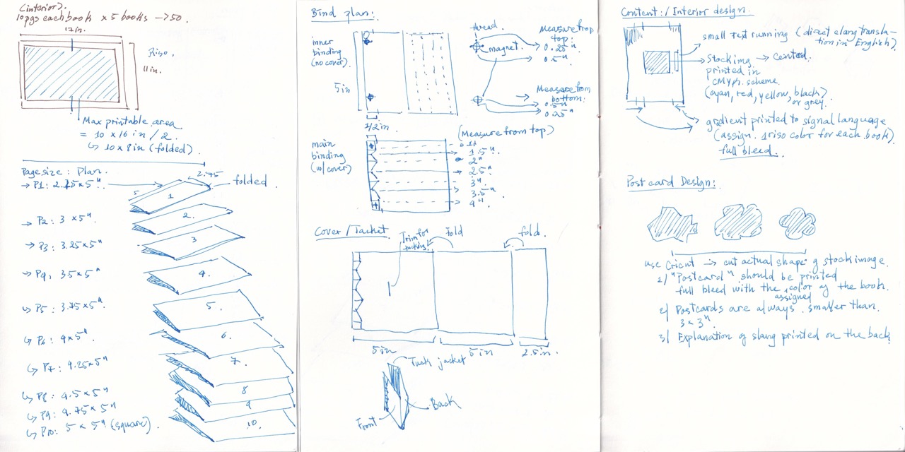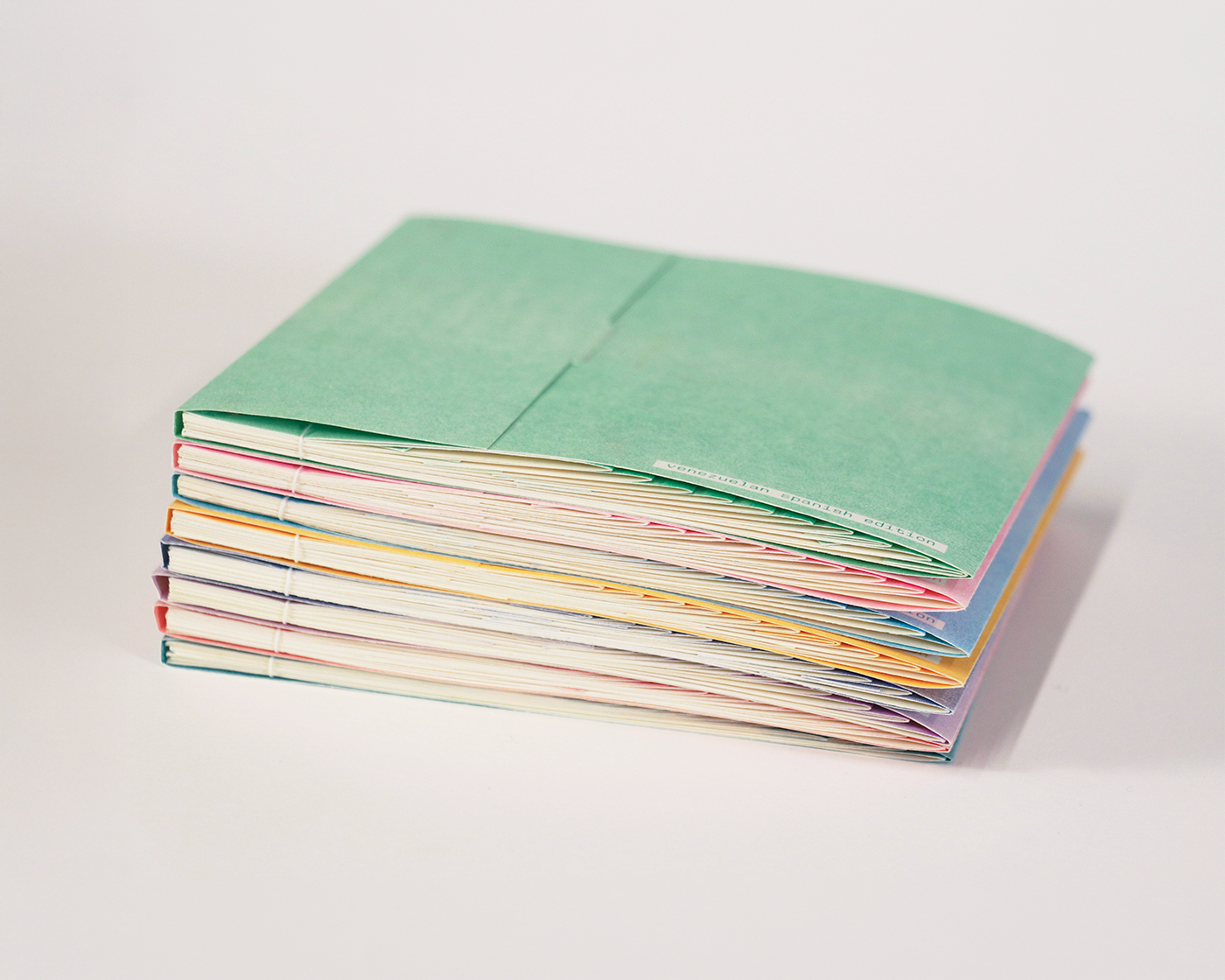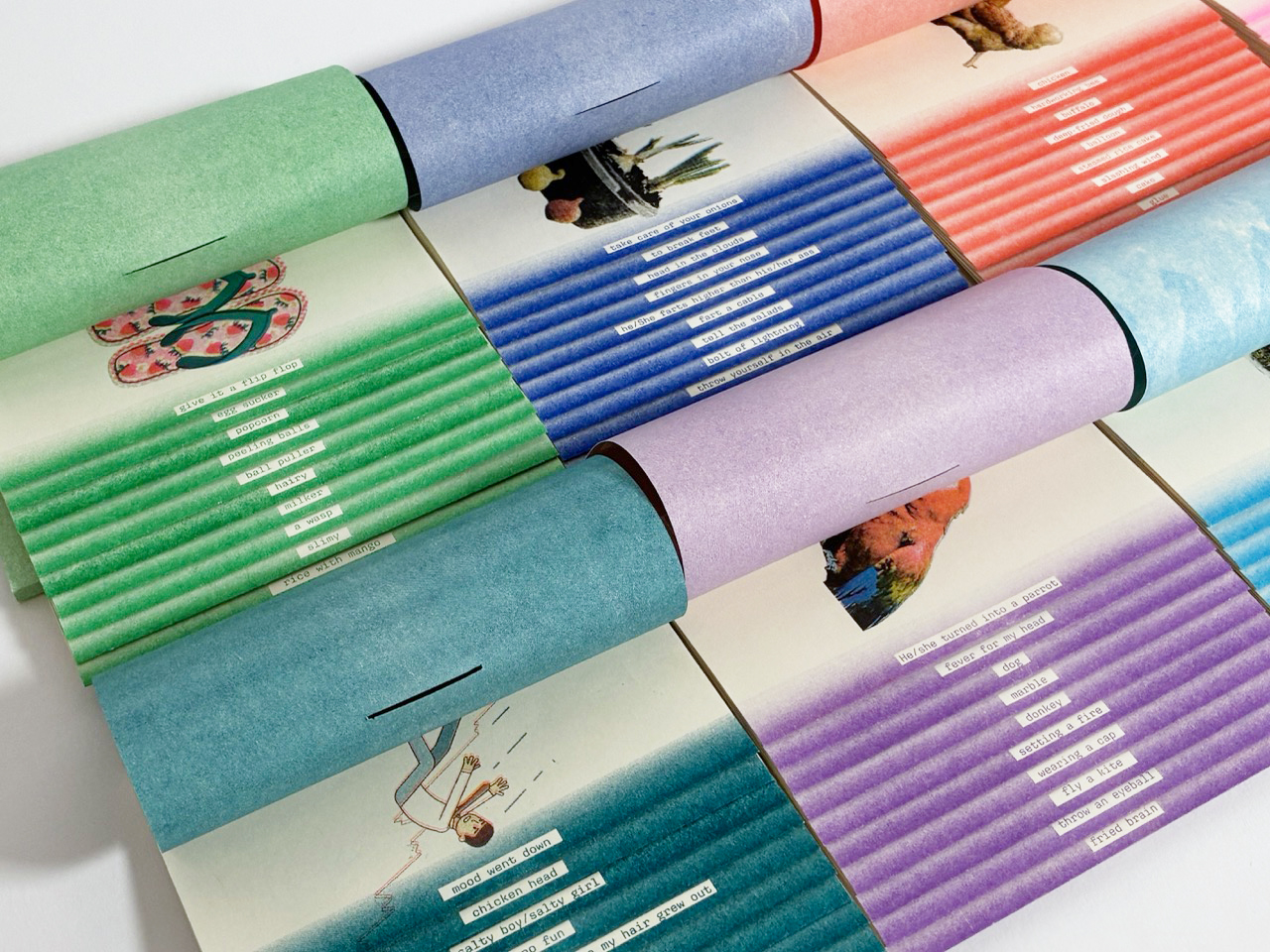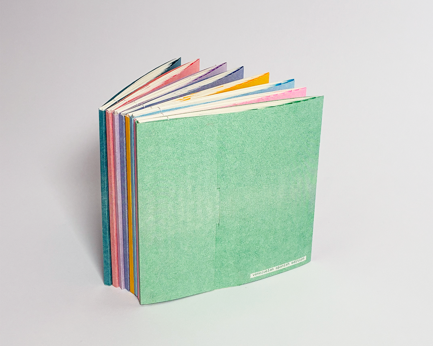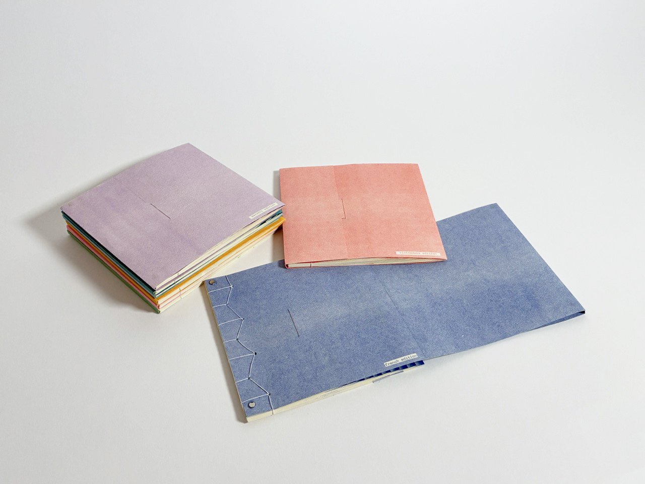 Japanese stab binding was chosen to conceal content between layers. Risograph introduced texture, misregistration, and saturated colors, reinforcing the playfulness of imagery. The staircase structure was created as a spatial metaphor for layers of language.